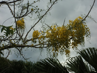Estas são flores que embelezam o calçadão, como esta árvore de acácias amarelas floridas.